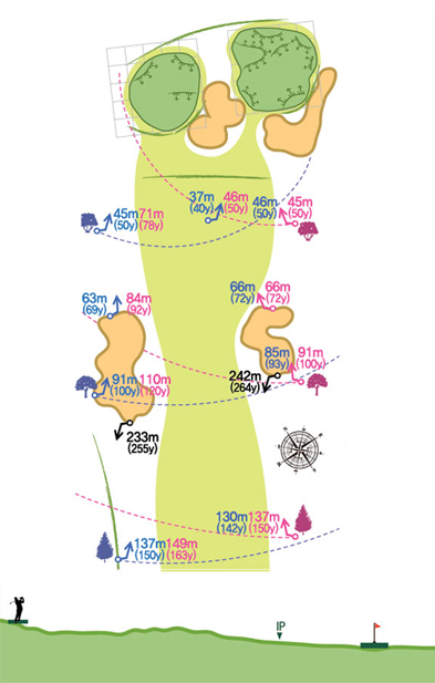 짧은 미들홀로서 서비스 홀이다. 좌우측에 OB 가 있는데 우측 OB를 주의해야 한다. 블라인드홀로서 시각의 오차가 심하고 생각보다 거리가 짧은 홀인 탓에 반 클럽 더 짧게 잡고 공략해야 한다. 슬라이스가 나면 OB 낼 확률이 크기 때문에 티 중앙에서 좌측 벙커를 보고 공략하는 것이 좋다.
