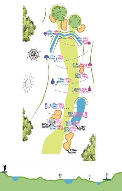 왼쪽으로 많이 휘어진 파5홀로 티샷ㅇ한 공의 위치에 따라 세컨 샷의 성공여부가 가늠되며 슬라이스에 유의 하여야 한다. 페어웨이 왼쪽 벙커와 오른쪽 해저드 사이가 가장 이상적인 IP지점이다. 세컨샷 시 생각보다 좌측 방향으로 공략하는 것이 유리하다. 그린 앞에 벙커들이 막고 있어 투 온을 욕심내는 것보다 탄도 높은 어프로치 서드샷으로 승부를 거는 것이 용이하다.