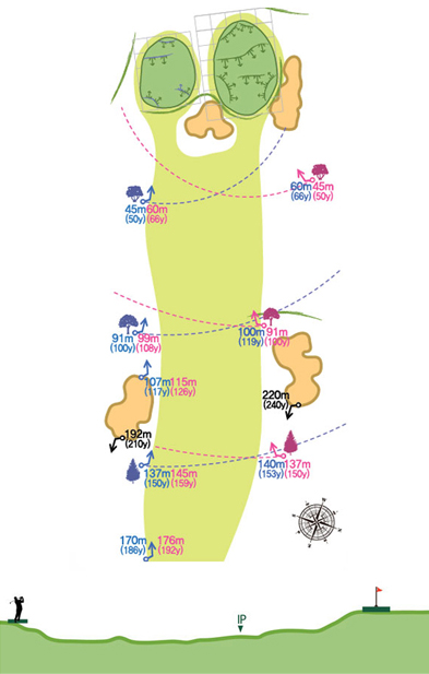 티샷 한 공의 낙하지점으로부터 오르막인 파4 홀오른쪽에 OB지역이 있다. 약간 슬라이스 날 우려가 있어 페어웨이 왼쪽 벙커보다 오른쪽으로 보내는 것이 안전하다. 그린공략은 한 두클럽더 길게 보며 오른쪽 그린 주변 벙커에 유의하여야 한다. 오른쪽 그린은 이단 그린으로 되어있고, 비교적 그린이 빠른 편이다.