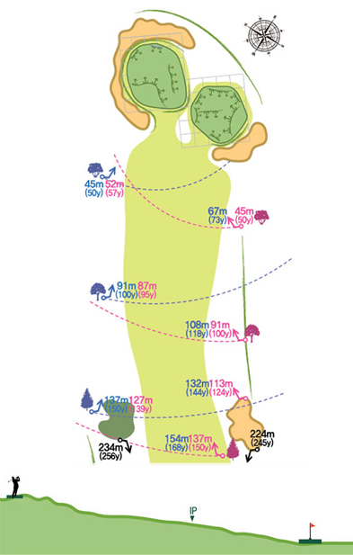 내리막 블라인드형 파4홀로 코스 좌, 우측 모두 OB지역이므로 티샷 시 방향성에 특히 유의 해야 한다. 세컨 샷시 심한 내리막으로서 한 두 클럽이상 짧게 공략해야 우리하다. 다운 힐 스탠스로 샷해야 할 경우가 많으므로 목표보다 왼쪽을 겨냥하는 것이 안전하다. 그린을 오버하면 OB이다.