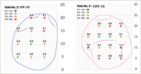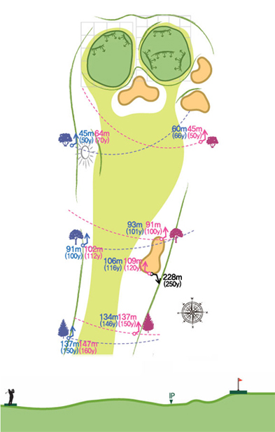 왼쪽으로 휘어지는 파 4홀 티잉 그라운드에서 그린이 잘 보이지 않아 슬라이스로 OB날 우려가 있으므로 왼쪽 산등성 하단을 겨냥하는 것이 좋다. 포대 그린임을 감안하여 한 클럽정도 여유있게 잡고 오른쪽 벙커를 유의하여 온 그린 공략하는 것이 안전핟.
