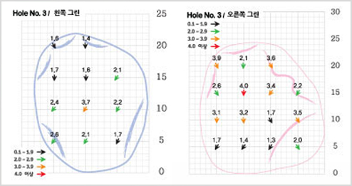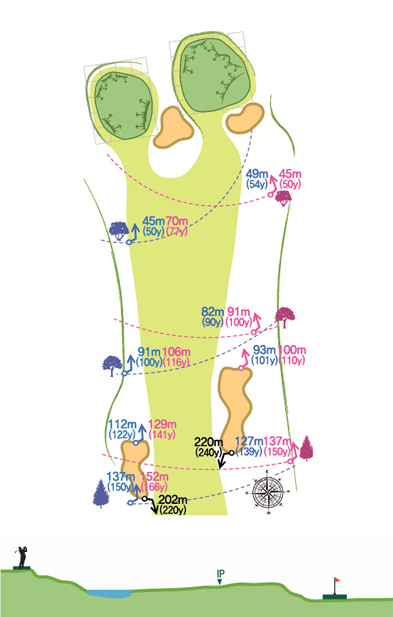 짧은 서비스 파 4홀로 티샷한 공이 종종 왼쪽OB지역으로 넘어간다. 안전하게 오른쪽 산등성 하단을 보거나 오른쪽 벙커보다 약간 왼쪽으로 보내면 성공적인 티샷이다. 숏 아이언만으로 쉽게 온 그린 가능하나 얖 벙커를 감안, 탄도 높은 샷이 유리하다.