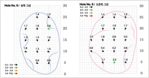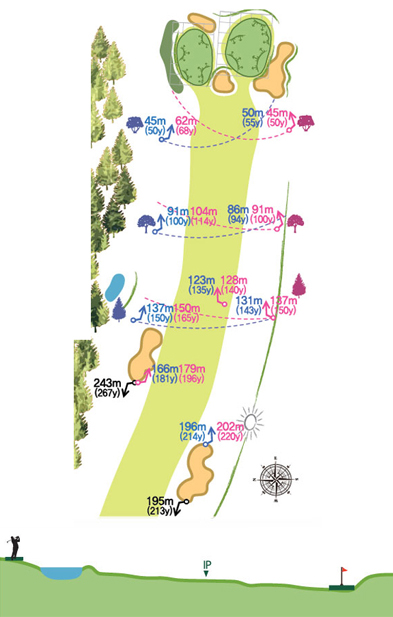 투 혼 시키기가 어려운 가장 긴 핸디캡 1번의 파 4홀로 오른쪽이 OB지역이다. 티샷은 오른쪽 나무 약간 왼쪽 끝을 겨냥하면 이상적이다. 세컨 샷에서 페어웨이 우드나 롱 아이언을 사용 할수밖에 없으나, 탄도 낮은 샷으로는 그린 앞 벙커들이 장해물이 된다.